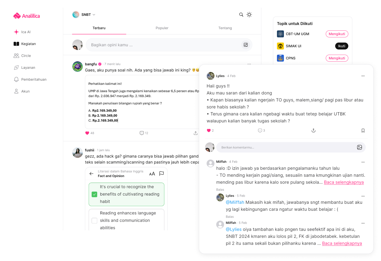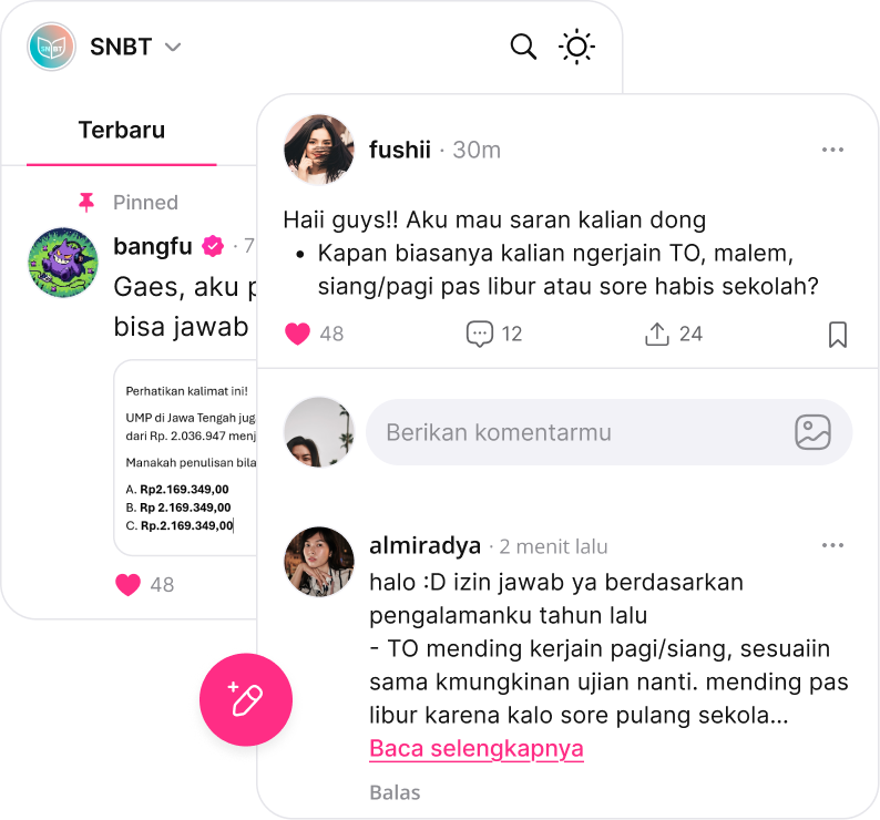 Bergabung dengan komunitas belajar yang interaktif. Diskusikan soal, berbagi tips, dan saling memotivasi dengan sesama pengguna agar belajar jadi makin seru!