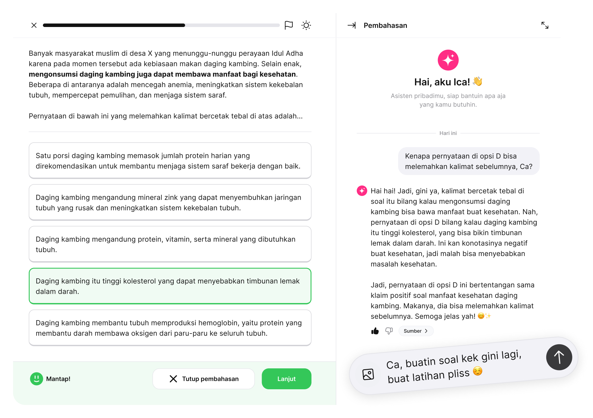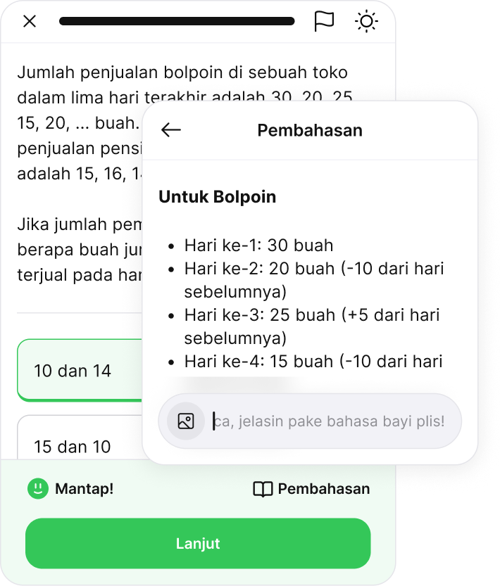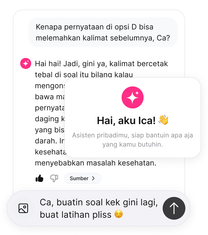 Nikmati bantuan asisten cerdas berbasis AI yang siap memberikan penjelasan instan dan mendetail untuk setiap soal yang membingungkan. Dapatkan bimbingan personal yang mempermudah pemahamanmu, kapan pun dibutuhkan.