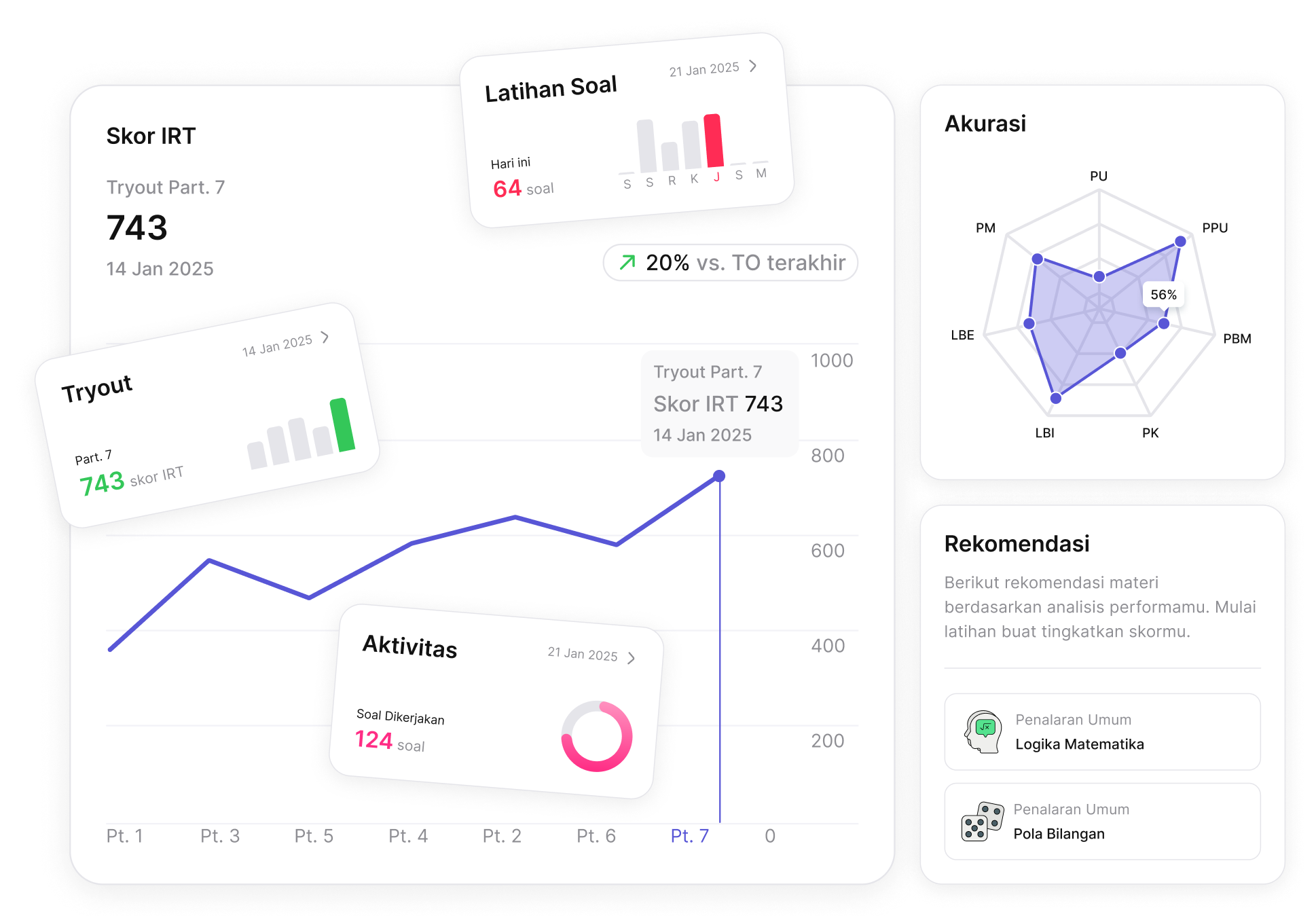 Lacak perkembangan belajarmu dari waktu ke waktu. Pantau skor, persentase peningkatan, dan dapatkan rekomendasi fokus belajar berdasarkan data performa pribadi.