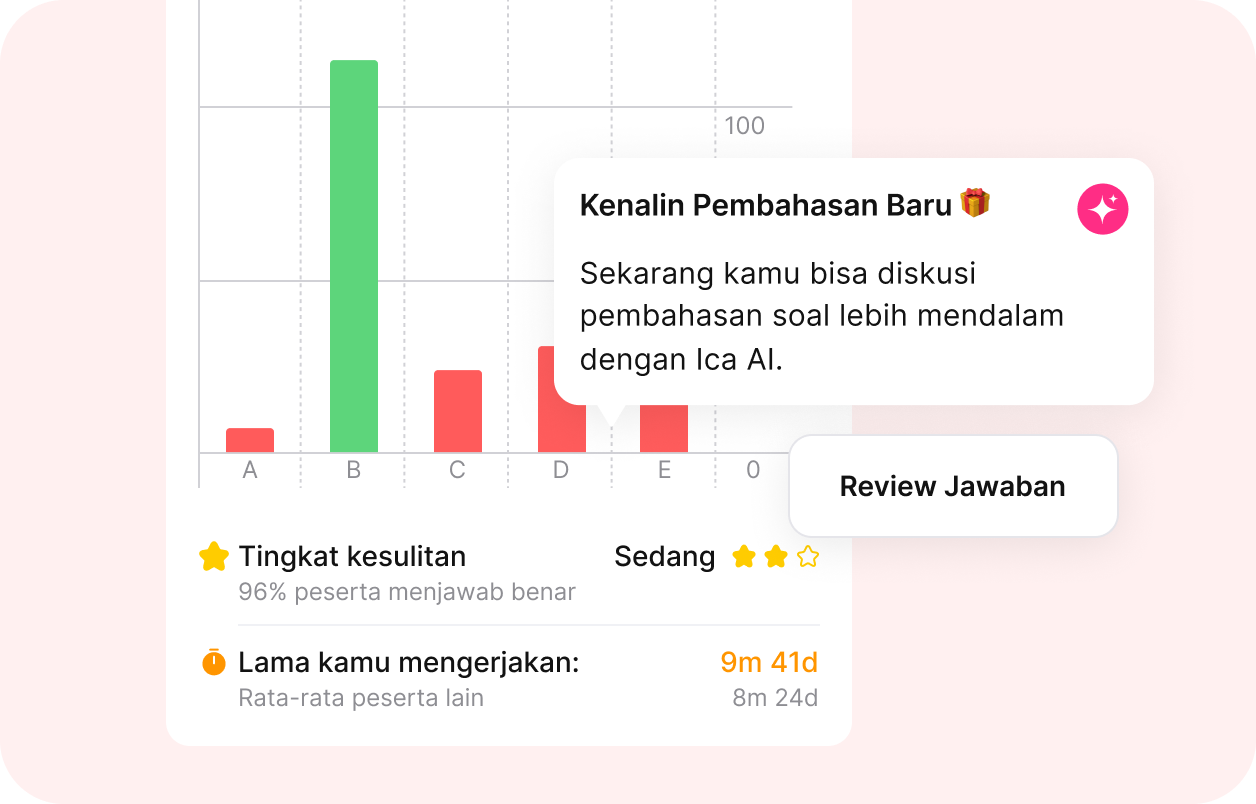 Begitu selesai, kamu akan langsung melihat skor beserta pembahasan detail untuk setiap soal. ICA AI siap memberikan penjelasan tambahan secara real-time, memastikan kamu memahami konsep di balik jawaban dengan tuntas.