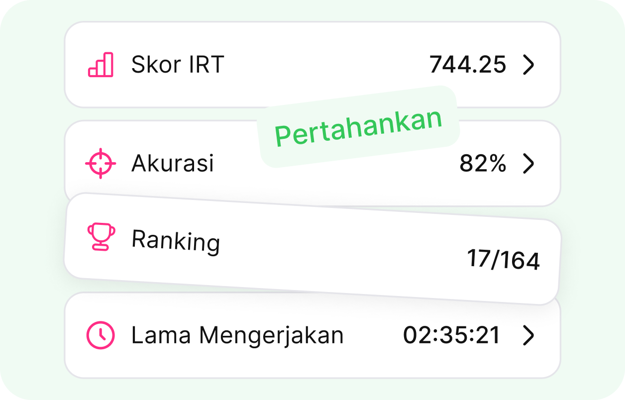 Ketahui grafik perkembangan, rekomendasi topik, serta ranking di antara peserta lain. Dengan mengetahui posisi relatifmu, lebih mudah memprioritaskan area yang butuh peningkatan agar hasilmu makin optimal.