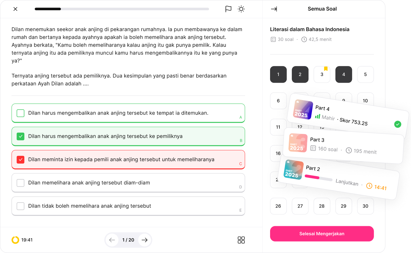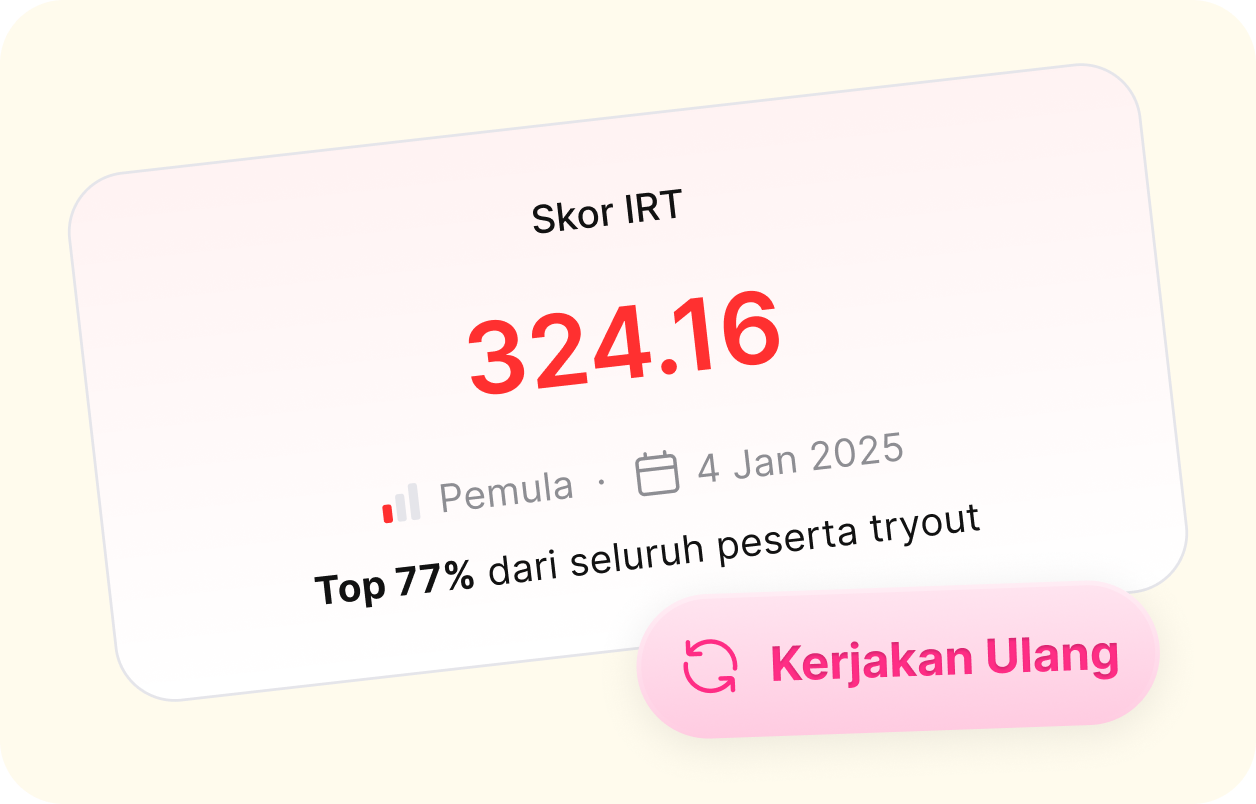 Mulai TryoutSimulasi ujian yang mendekati kondisi sebenarnya—mulai dari format, durasi, hingga bobot kesulitan. Tingkatkan kepercayaan diri dan temukan area yang butuh perbaikan untuk hasil terbaik di ujian nyata.