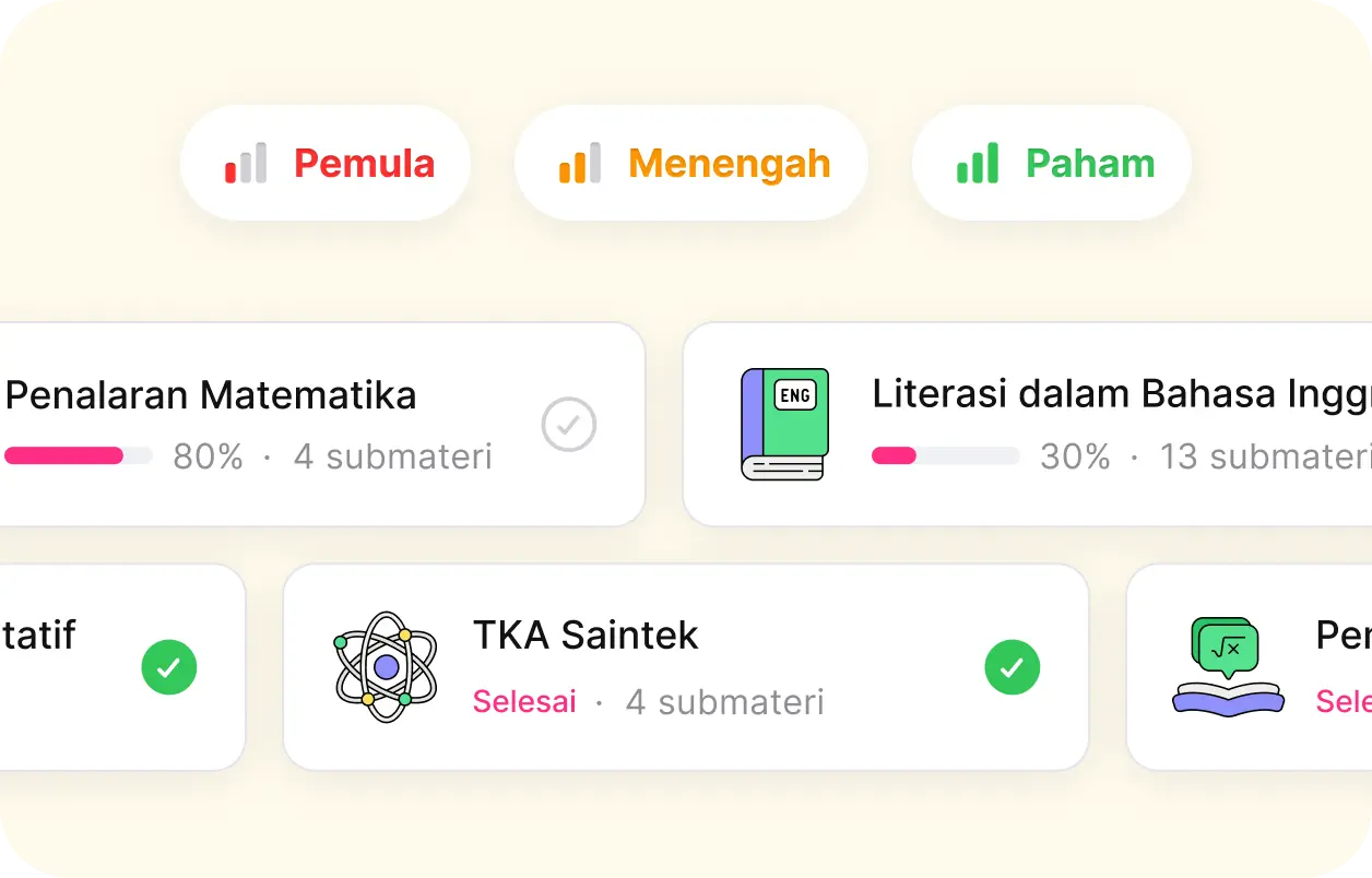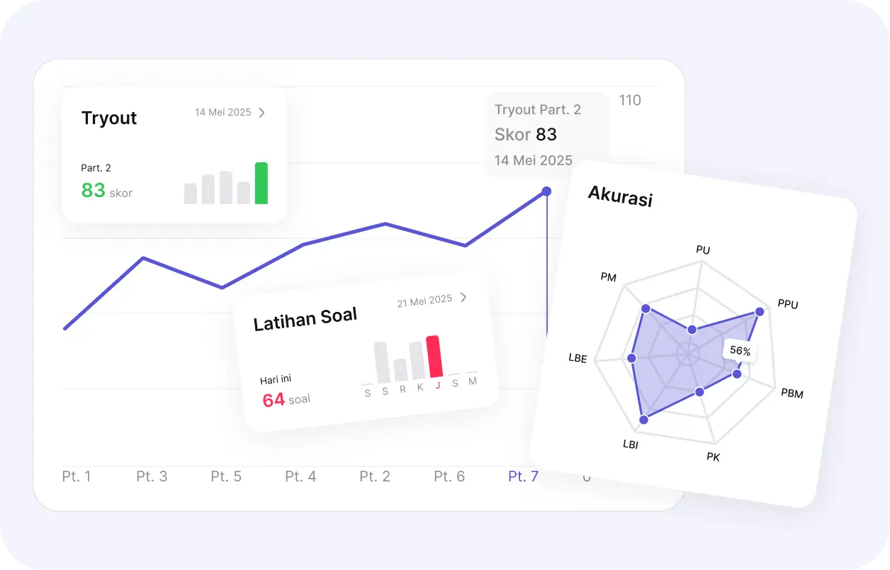 Nikmati pengalaman belajar komprehensif dengan latihan berkala, tryout, bimbingan AI, forum diskusi, dan laporan mendalam hanya di satu platform.