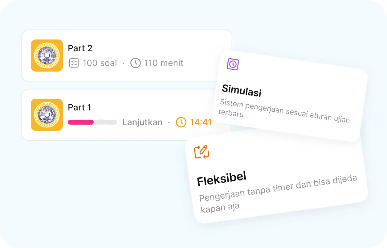 Rasakan ujian dengan sistem, durasi, dan komposisi soal yang mendekati ujian sebenarnya sesuai dengan ketentuan ujian mandiri masing-masing PTN. Jadi, gunakan ini untuk atur strategi manajemen waktu.