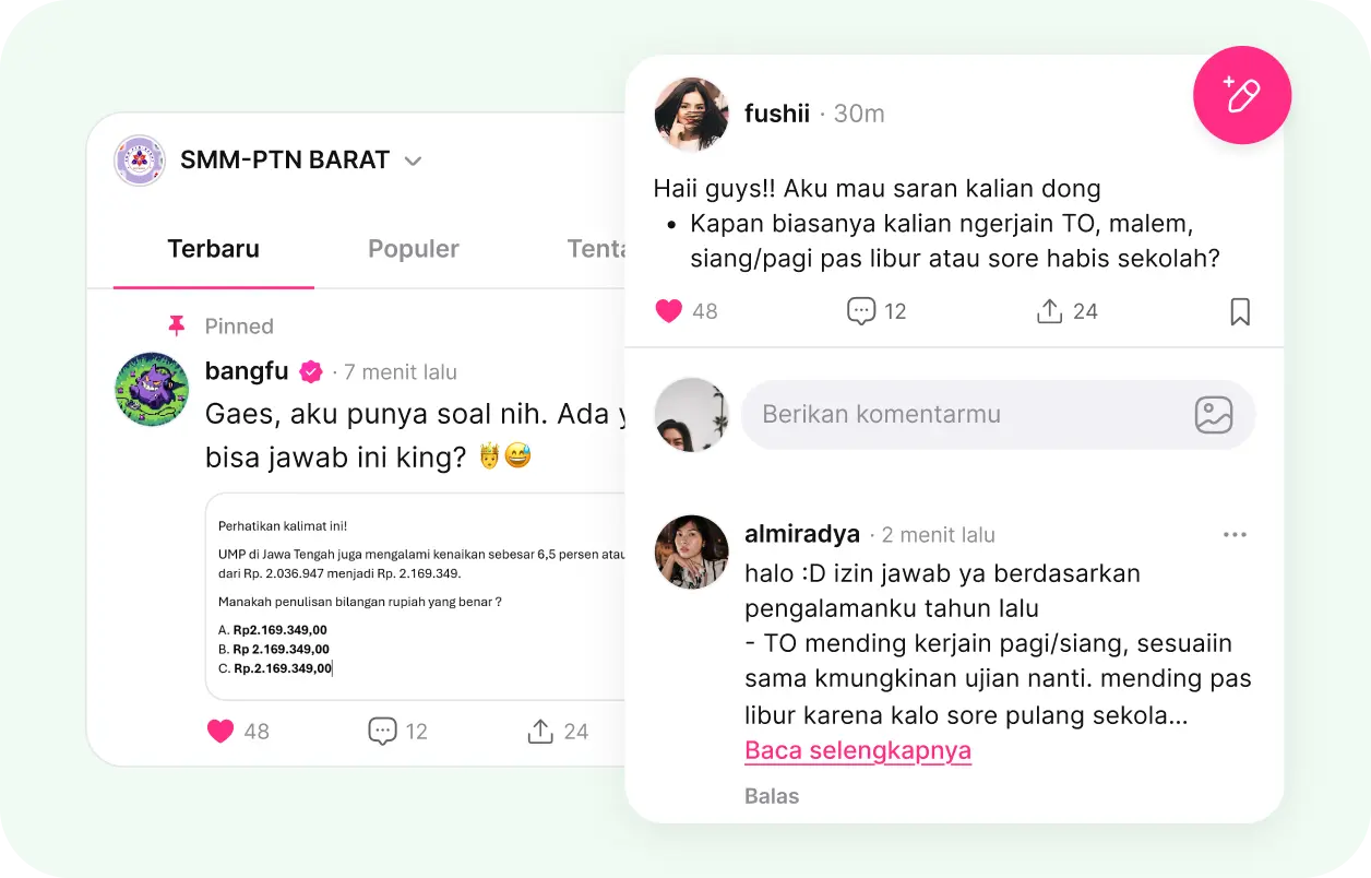 Pelajari lebihGabung diskusi bersama sesama peserta Ujian Mandiri masing-masing PTN. Ajukan pertanyaan, berbagi tips, dan temukan motivasi baru. Mentor dan pengguna lain siap membantu jika ada soal atau konsep yang sulit.